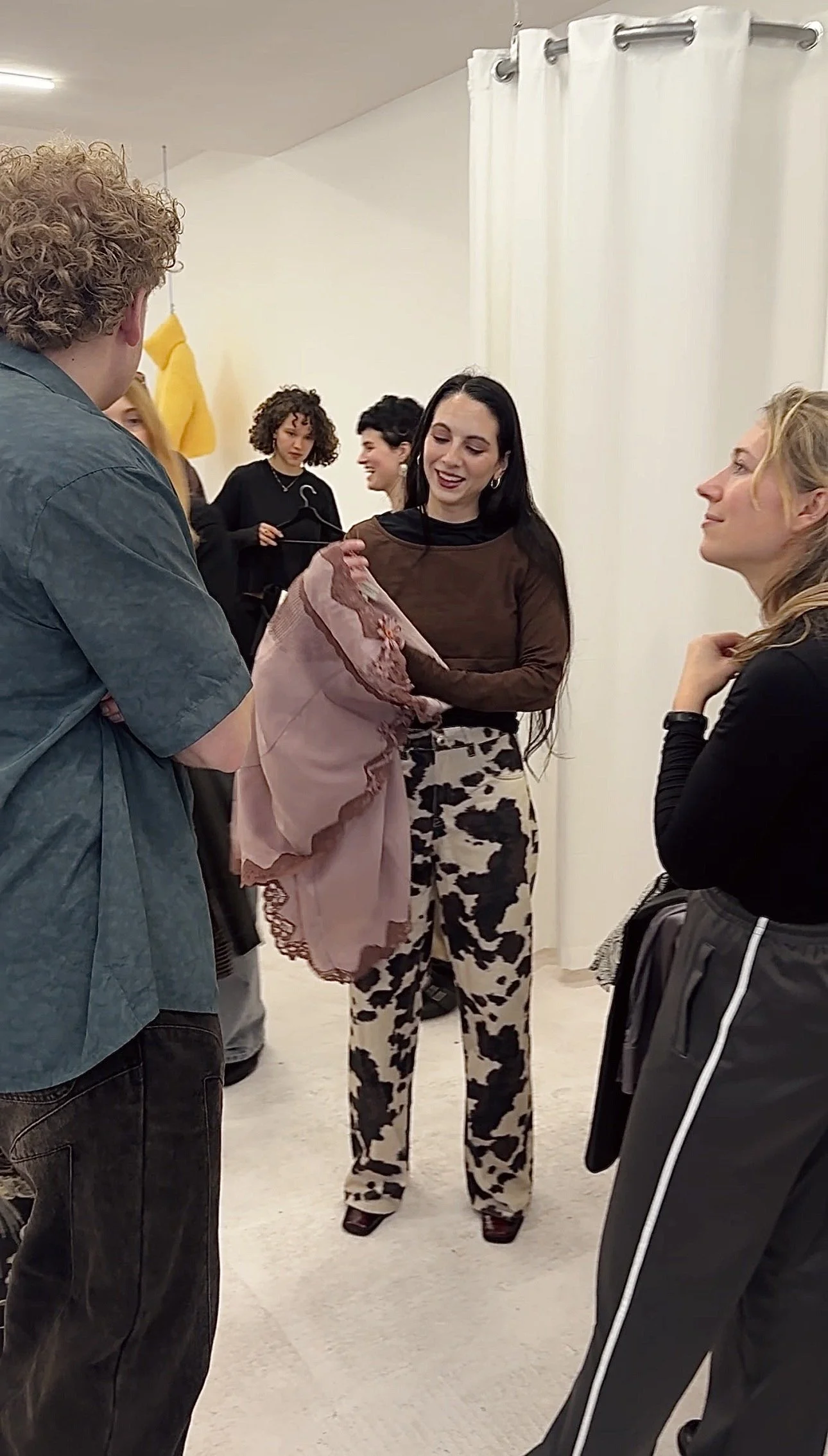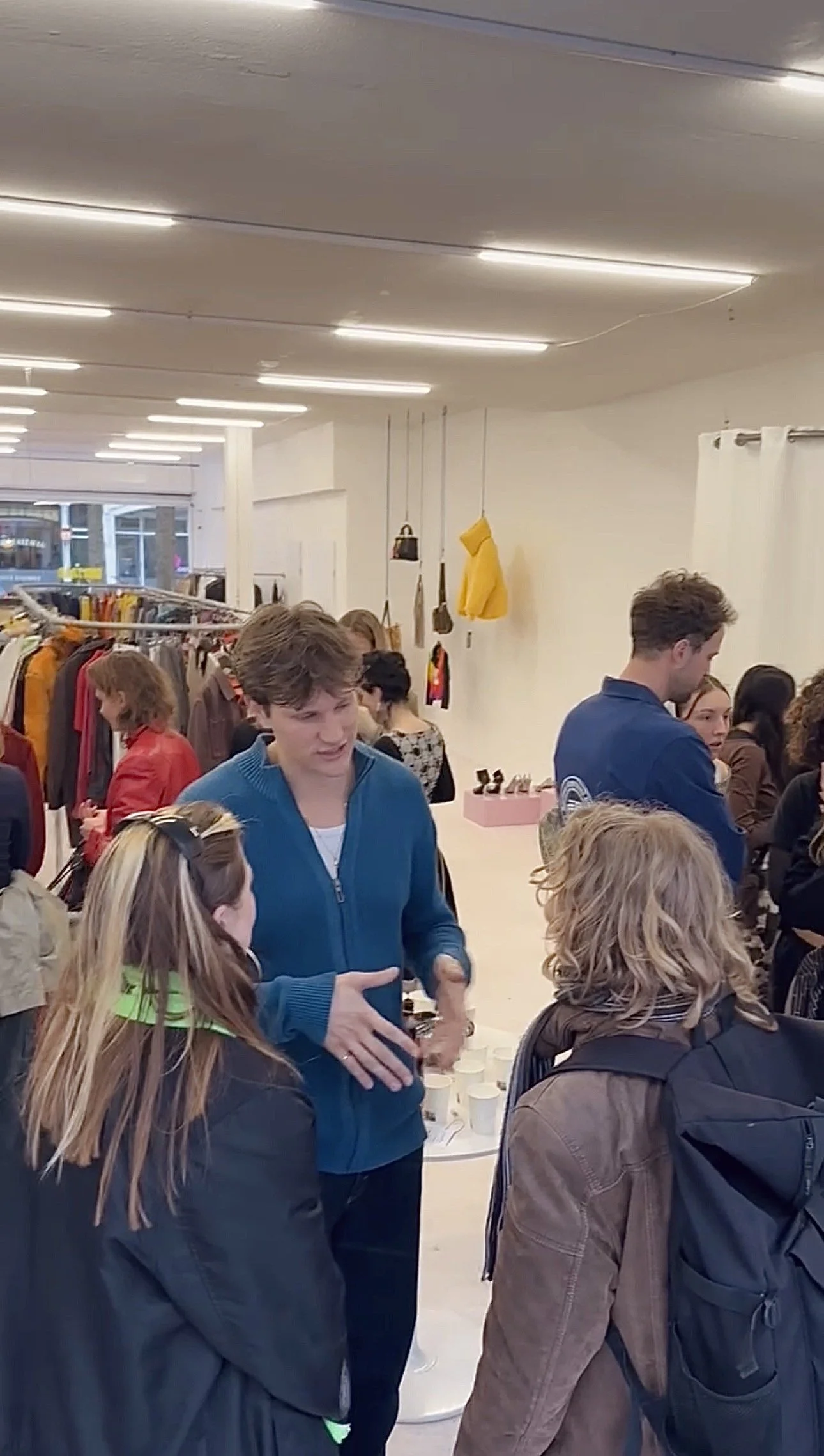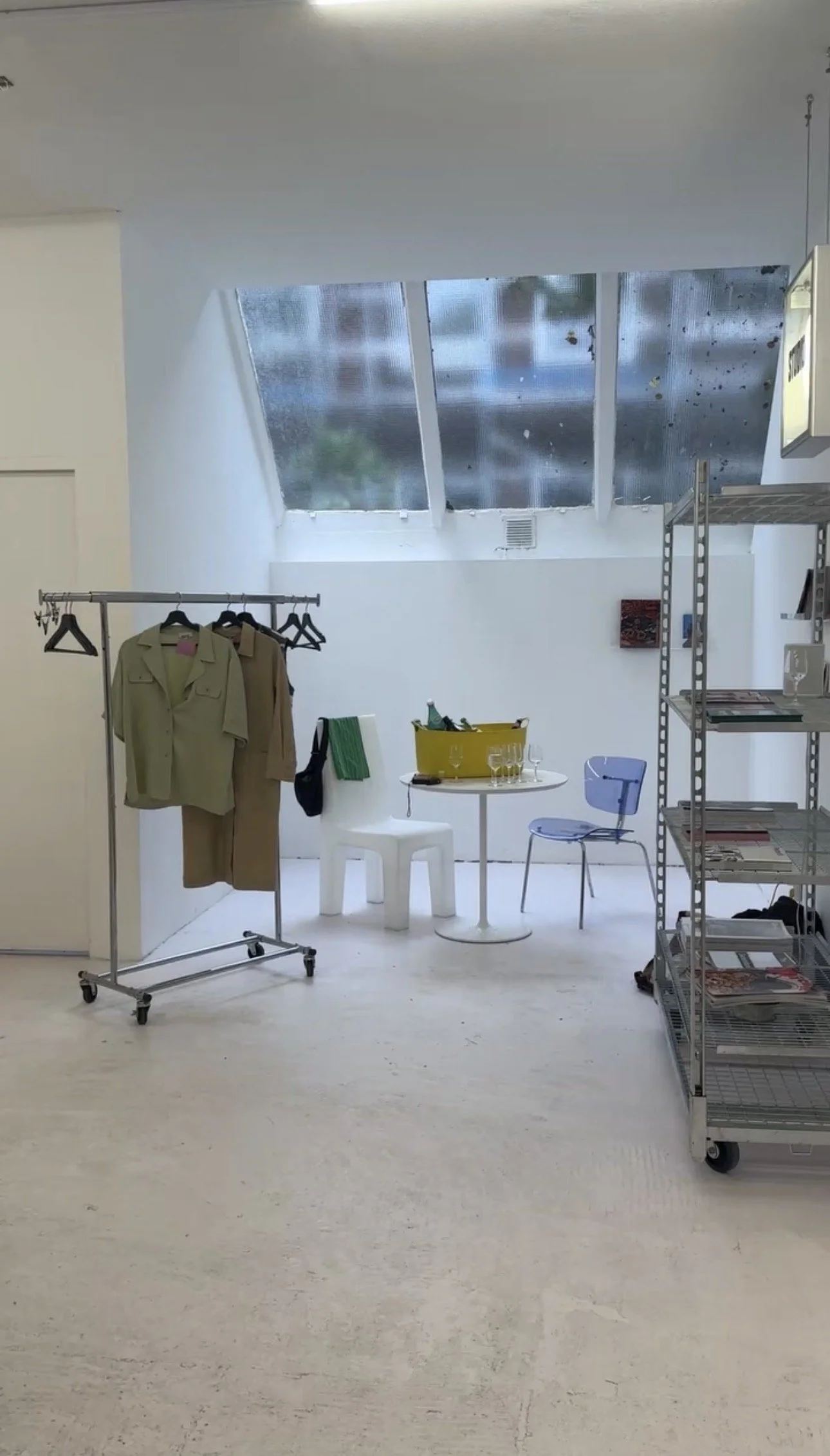 you walk in. there's a rail near the entrance. if you brought a favorite piece, you hang it there. then you scout. walk through the store, see what's hanging. no pressure to talk to anyone yet. just you and the pieces.
